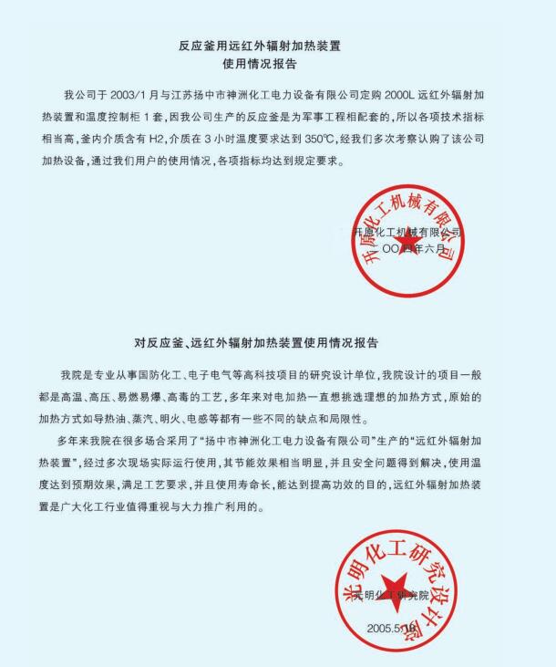 反应釜用远红外辐射加热装置使用情况报告
